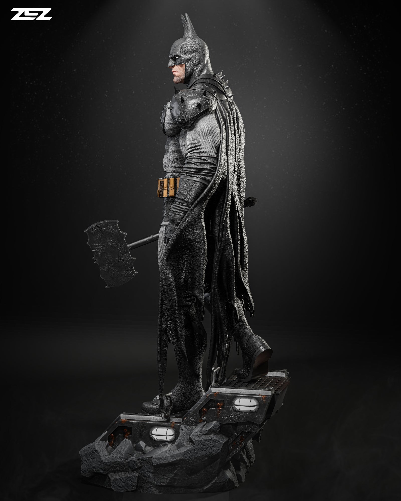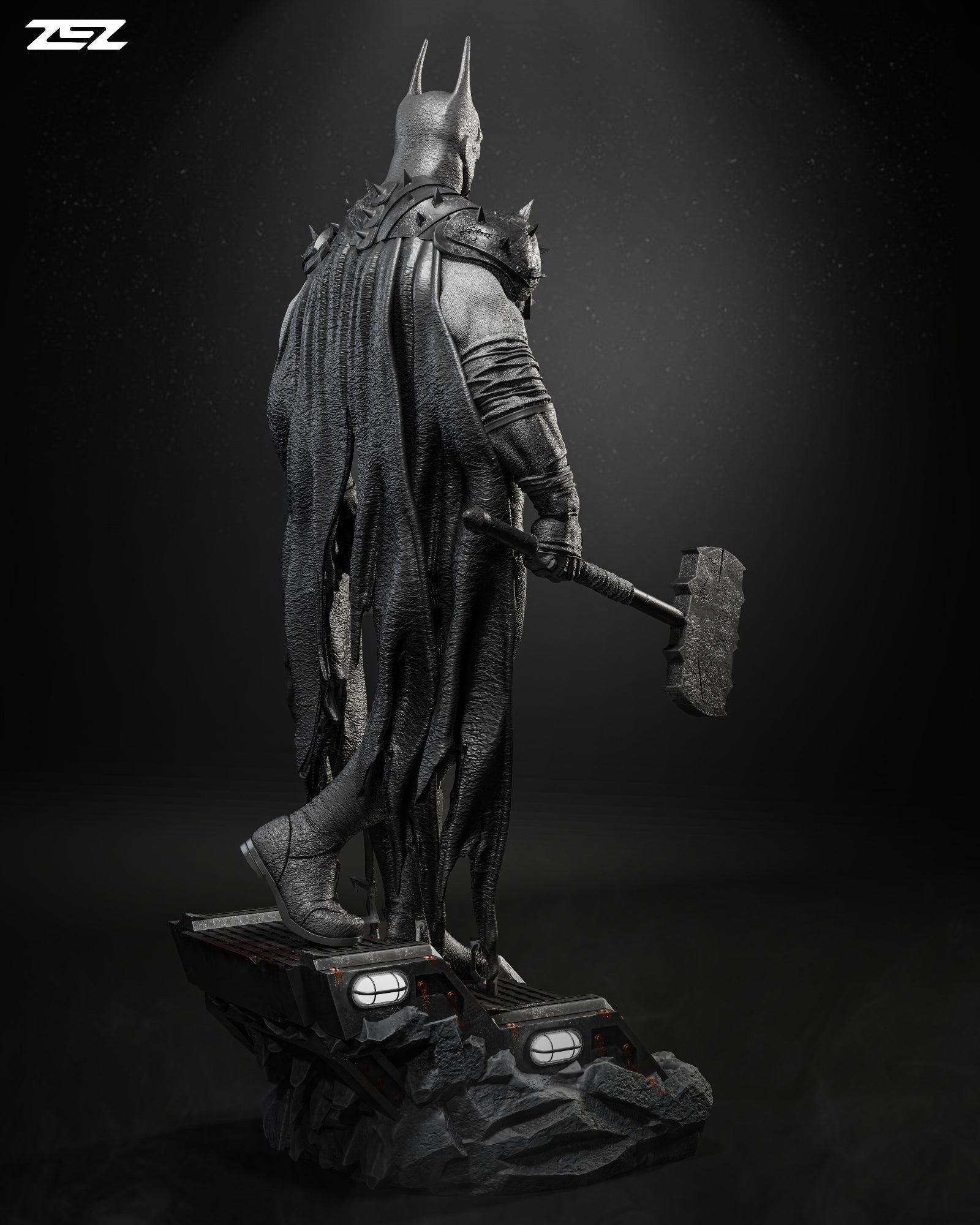 Absolute Batman collectible in 1:6 scale stands with spiked armor and massive hammer. Features rugged textures, tactical belt, and a rocky tech base. Includes matching bust with grim expression and shoulder armor. Ideal for dark DC Comics statue collectors.