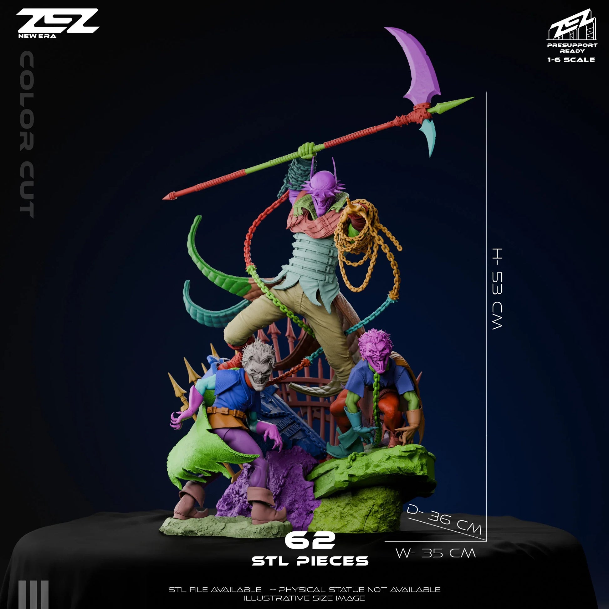 3D printed Batman Who Laughs collectible bust and diorama in 1:6 scale. Features the sinister armored villain with chains, minions, and graveyard base. Perfect for DC Comics fans and collectors of dark Batman figures. Made to order by Dungeon Master Minis.
