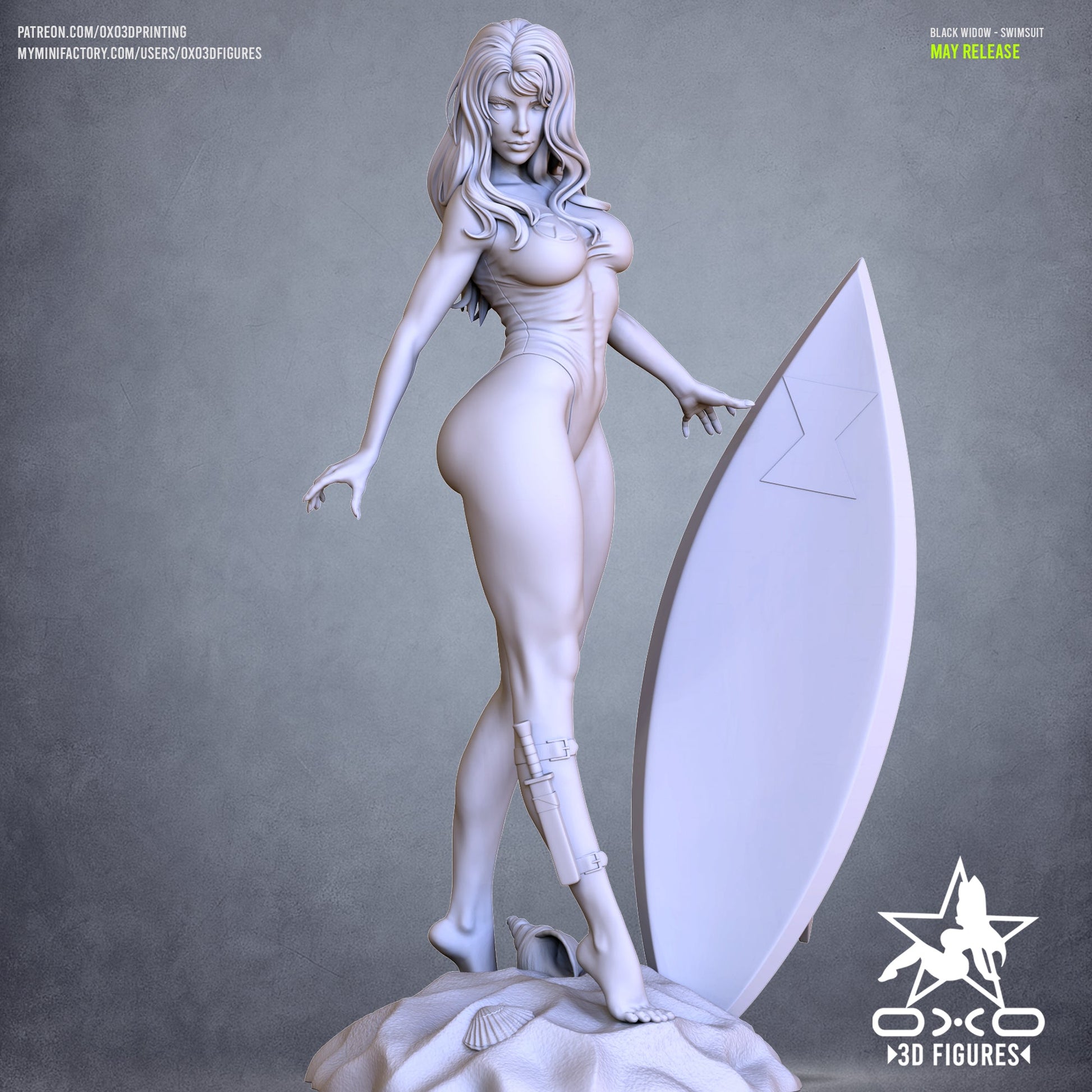 Black Widow Swimsuit Edition figure from Marvel Comics in 1:10 scale. This collectible includes SFW and NSFW versions, features a dynamic beach pose with surfboard, and comes in 14 modular parts for easy printing and painting. A stunning and bold rendition of Natasha Romanoff.
