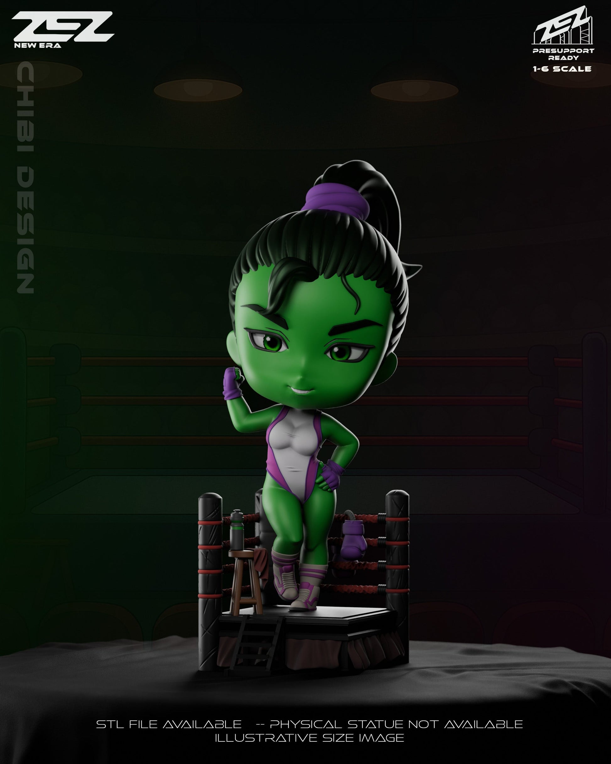 Chibi She-Hulk flexes confidently in a 1:6 scale collectible display, standing in a boxing ring with her gloves slung over the ropes. With bold expression, fists raised, and hair tied back, this stylized Marvel Comics figure packs attitude into every inch of its compact chibi frame.