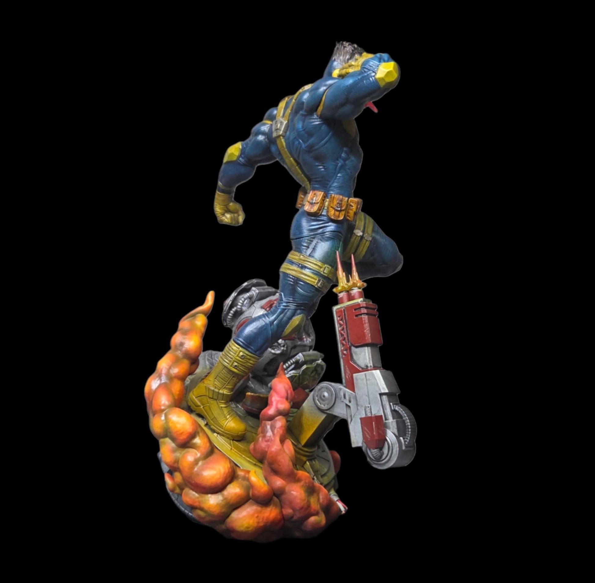 Cyclops from Marvel Comics stands in a commanding pose mid-blast, wearing his signature visor and tactical X-Men uniform. This 1:6 scale collectible features a dynamic base of shattered Sentinel tech and includes a fierce bust with optic beam activation. Perfect for superhero statue collectors.