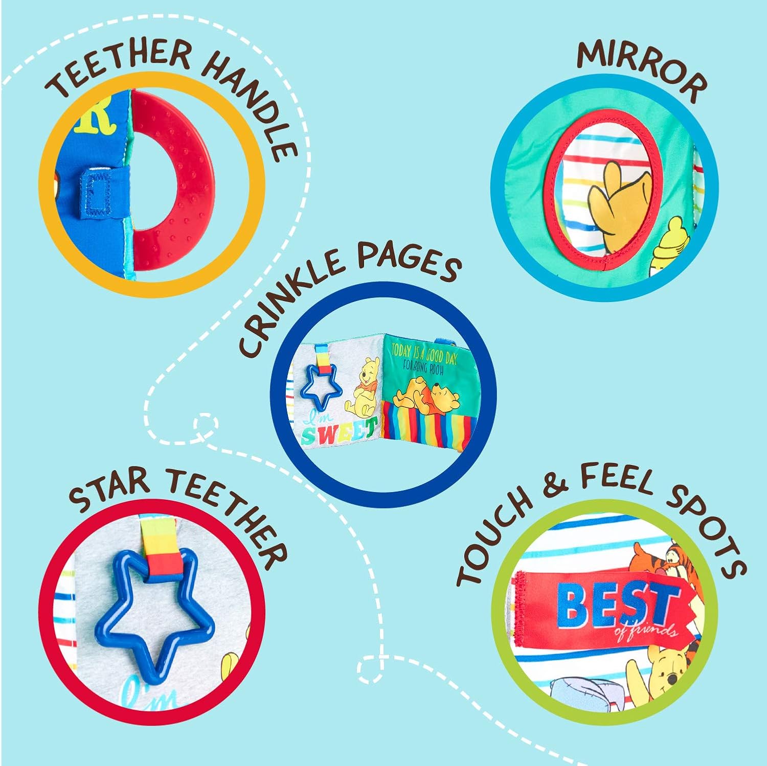 - Features crinkly pages, a teether handle, mirror, and touch-and-feel elements for sensory engagement