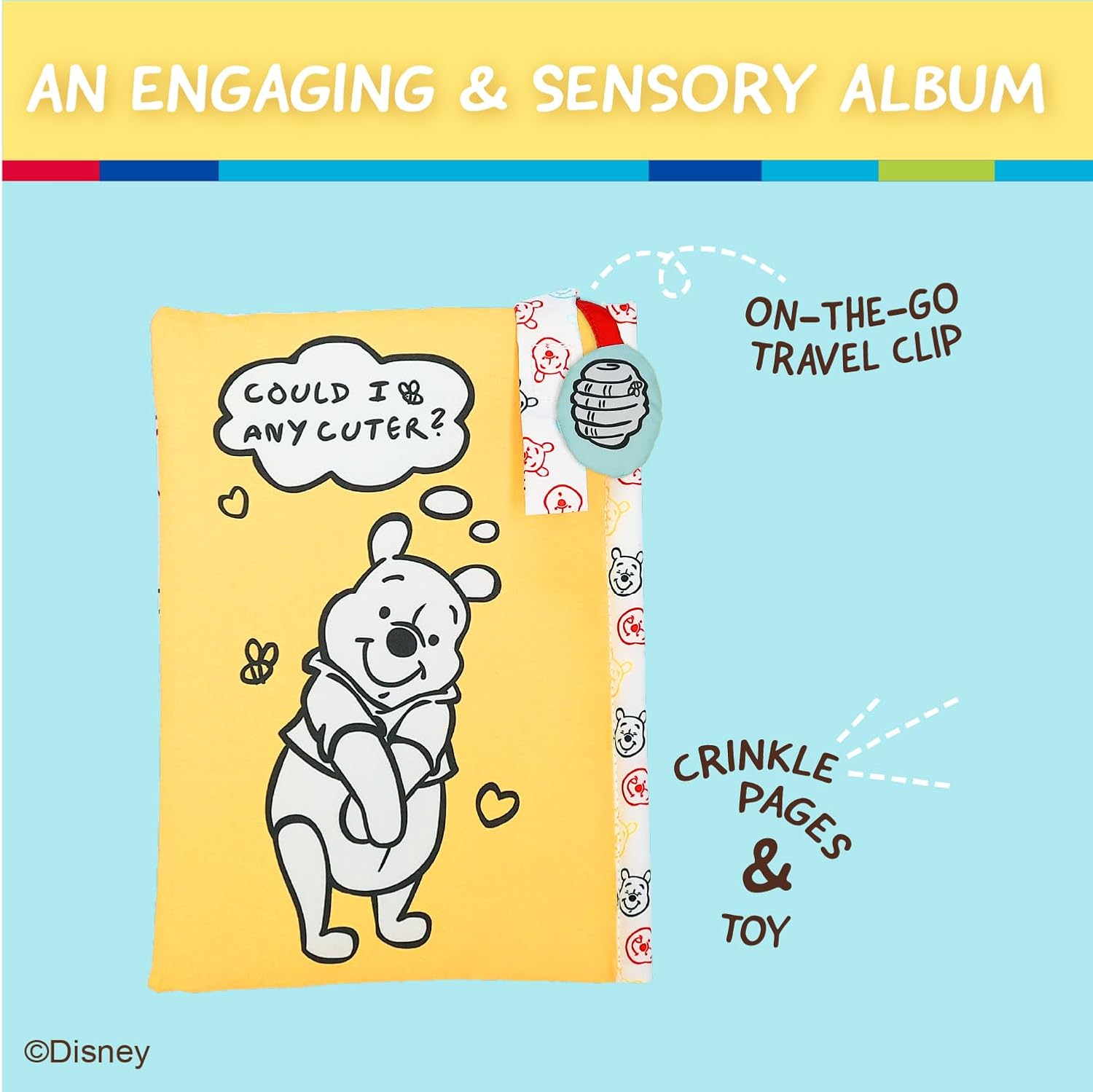 The album not only holds three 4" x 6" photos but also has soft pages that feature crinkle sounds, engaging babies and toddlers as they interact with their favorite faces. This sensory element makes playtime more entertaining and aids in their development by helping them recognize familiar loved ones. Equipped with a convenient on-the-go strap, it can easily attach to strollers, car seats, or cribs for use at home or while traveling. The Disney Winnie The Pooh My First Photo Book makes a heartfelt gift for baby showers or welcoming new babies into the world, nurturing a love for memories right from the start!