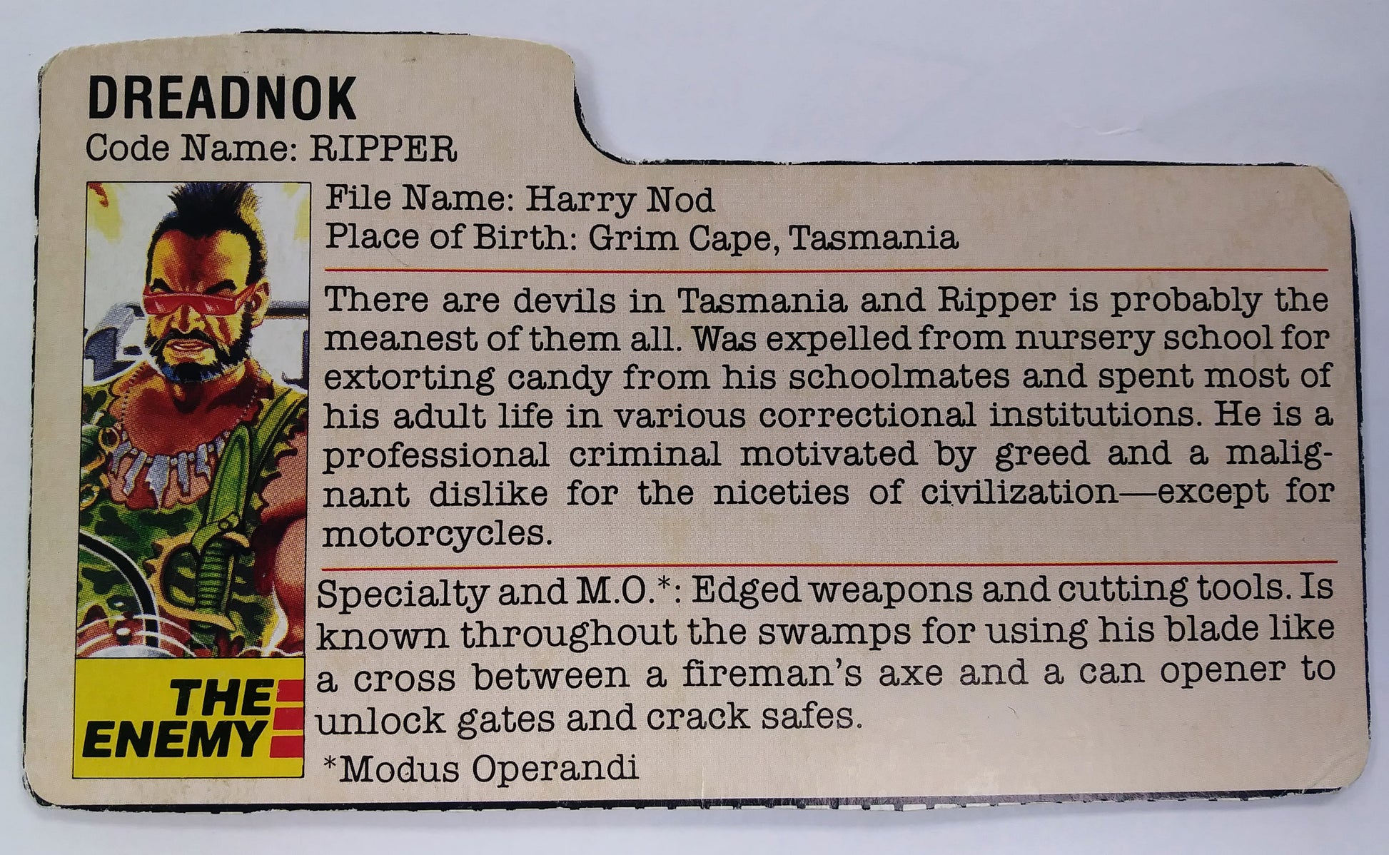 1985 Dreadnok action figure from Hasbro - Ripper. Loose, includes original file card. Broken O-ring, needs repair.