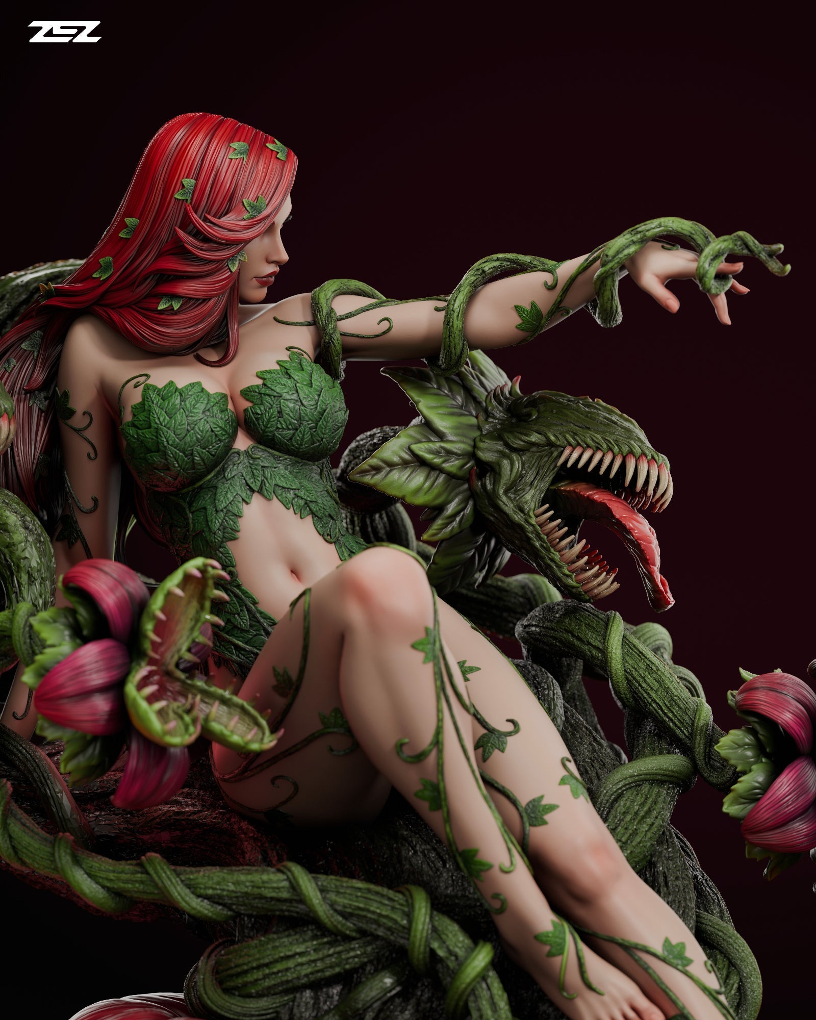 Poison Ivy collectible figure and bust, featuring the DC Comics femme fatale seated on a carnivorous plant throne. Adorned with vine-covered attire and surrounded by monstrous flora, this statue captures her seductive and dangerous presence. A must-have for Batman fans and statue collectors.