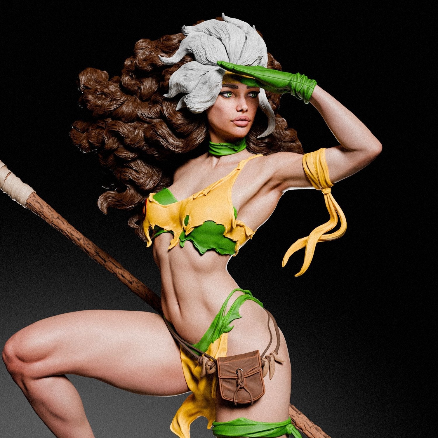 This striking Rogue Savage figurine captures the iconic X-Men character in her Savage Lands attire. Posed with her spear atop a dinosaur skull, Rogue's dynamic stance and wild hair bring her fierce personality to life. Perfect for collectors, this piece is available in display or painting options.