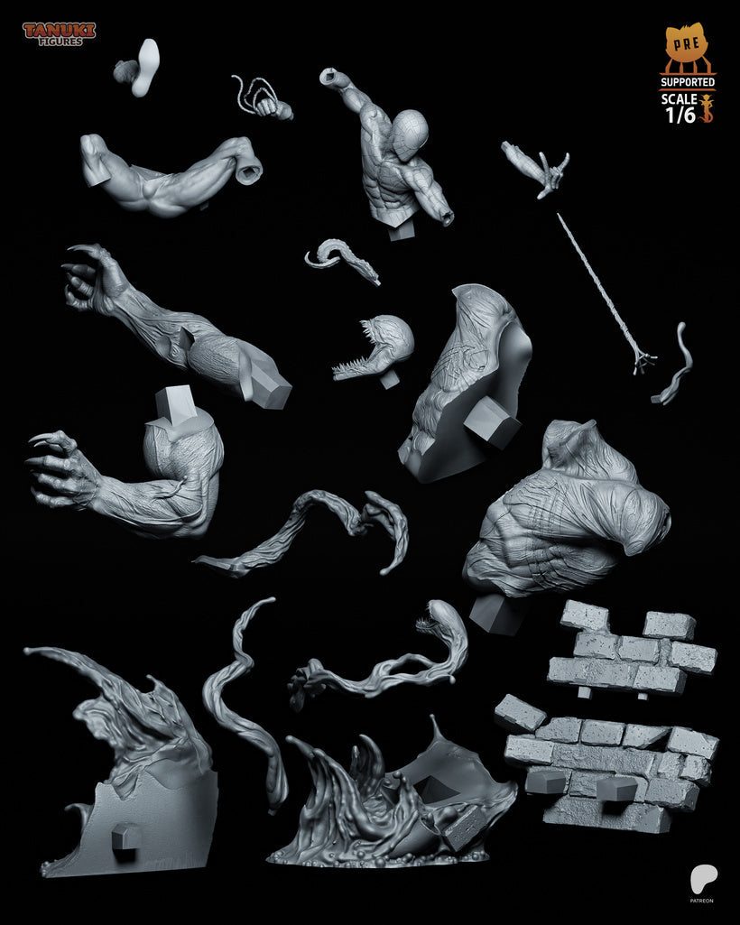 Dynamic 1:6 scale Spider-Man vs Venom diorama featuring mid-air combat over urban rubble with oozing symbiote tendrils. Includes separate busts of Spider-Man in web-slinging pose and Venom with dual snarling heads. A must-have Marvel collectible for fans and painters.