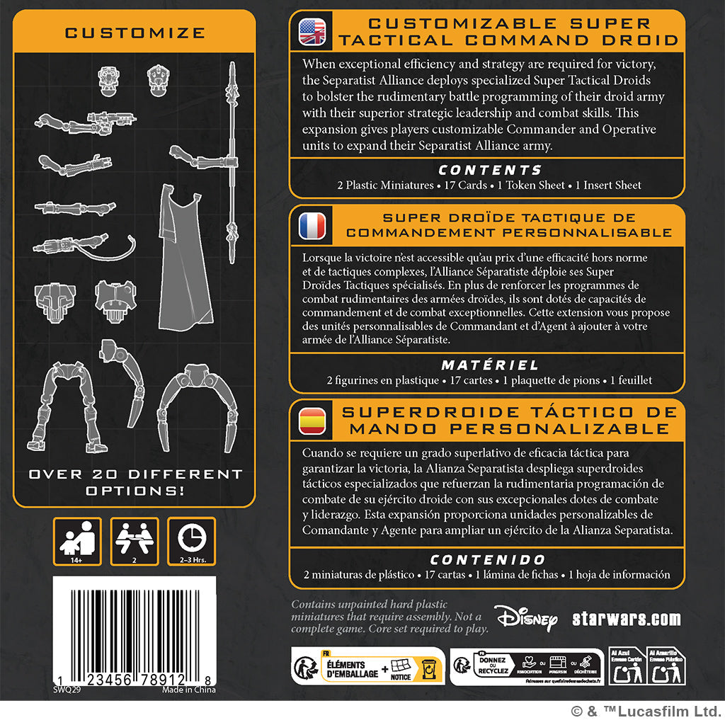 This Star WarsTM: Legion Separatist Alliance Commanders and Operatives Expansion gives players two customizable Commander and Operative units to expand their Separatist Alliance army. The Separatist Alliance Super Tactical Command Droid pack allows players to build two customized Separatist Alliance characters that can be used as either a Commander or Operative when building their Separatist Alliance armies.