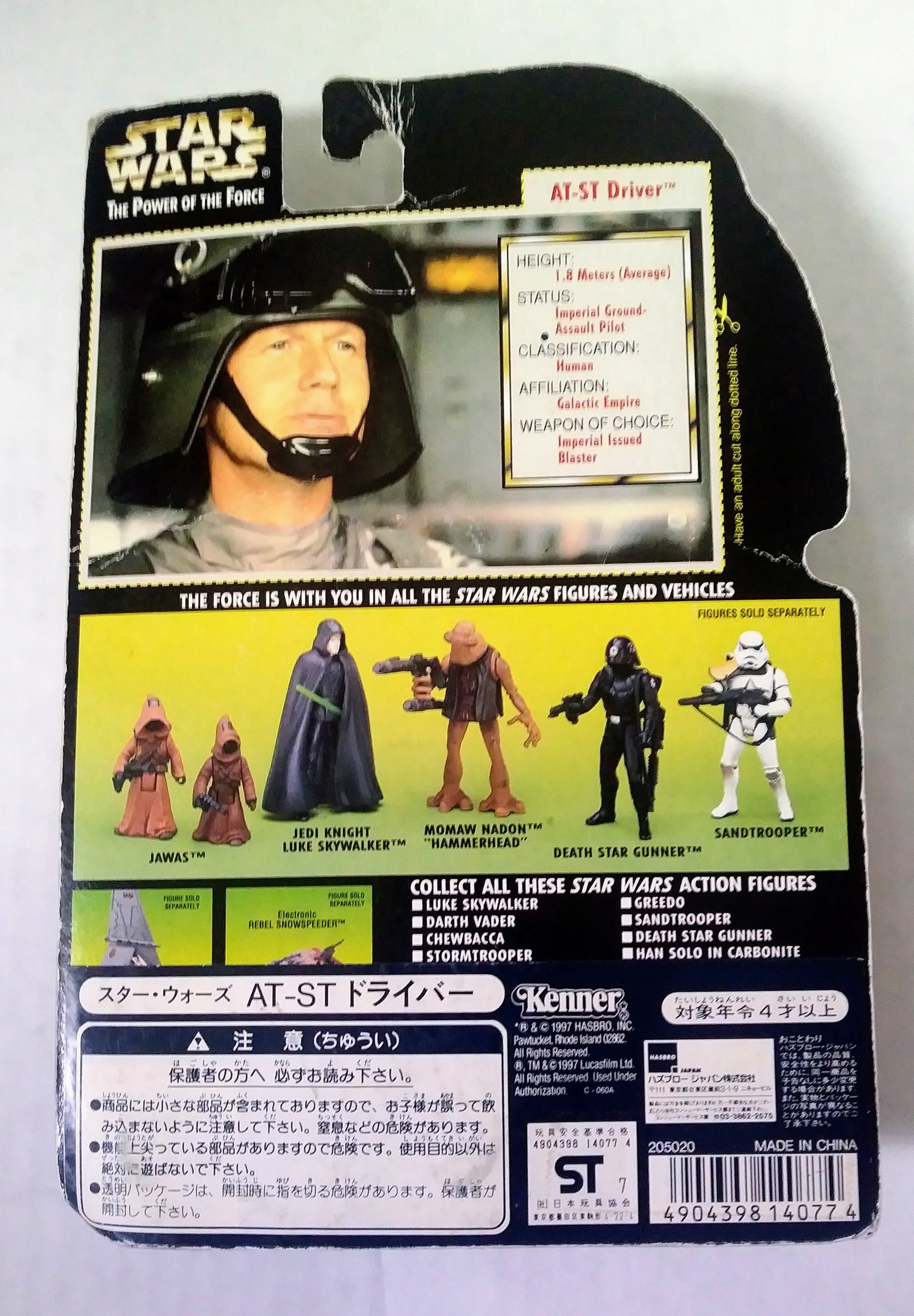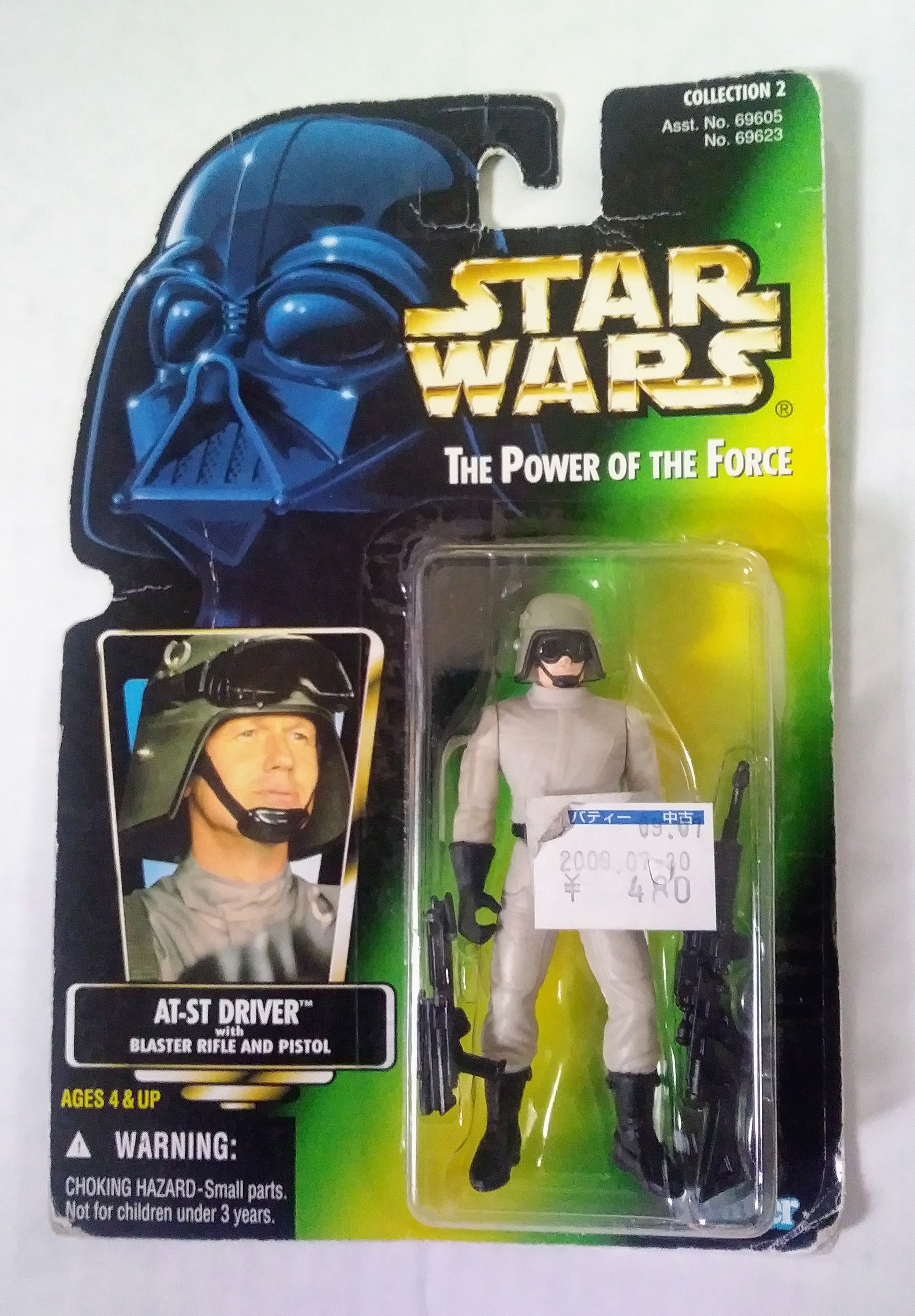 1997 Star Wars Power of the Force figure from Kenner - AT-ST Driver. Still in original packaging with blaster rifle and pistol.
